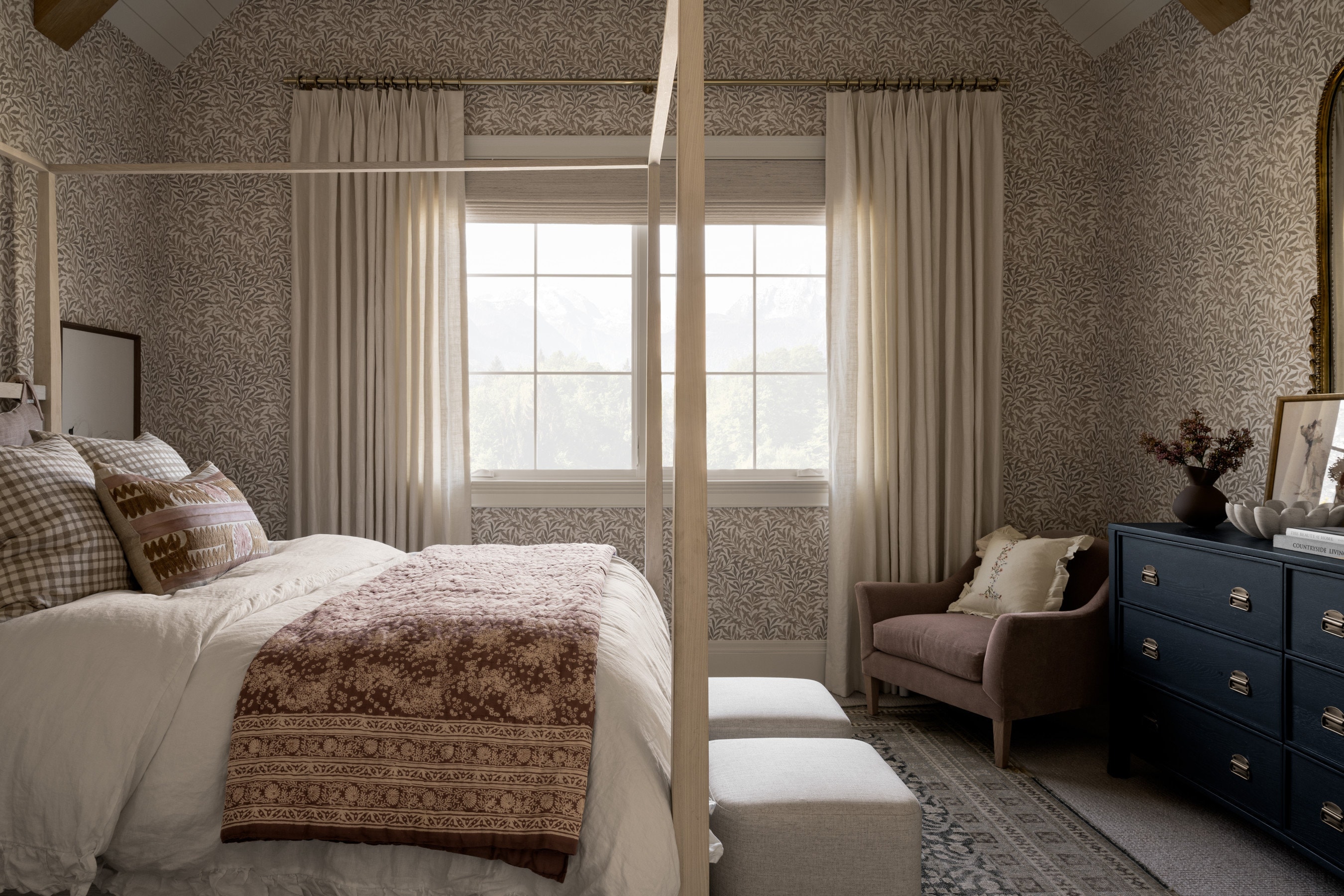 Wanting to play with pattern in Ivy’s room, Shea employed the help of our Willow Boughs wallpaper by Morris & Co., and paired it with the bathroom’s Pimpernel Wallpaper also by Morris & Co. The majority of the furniture stayed the same, except for the Prudence Chair in mohair velvet and the Mackenna Dresser. Shea added a few styling pieces like the Tess Ceramic Table Lamp and the Neutral Swan artwork and the room refresh was complete.