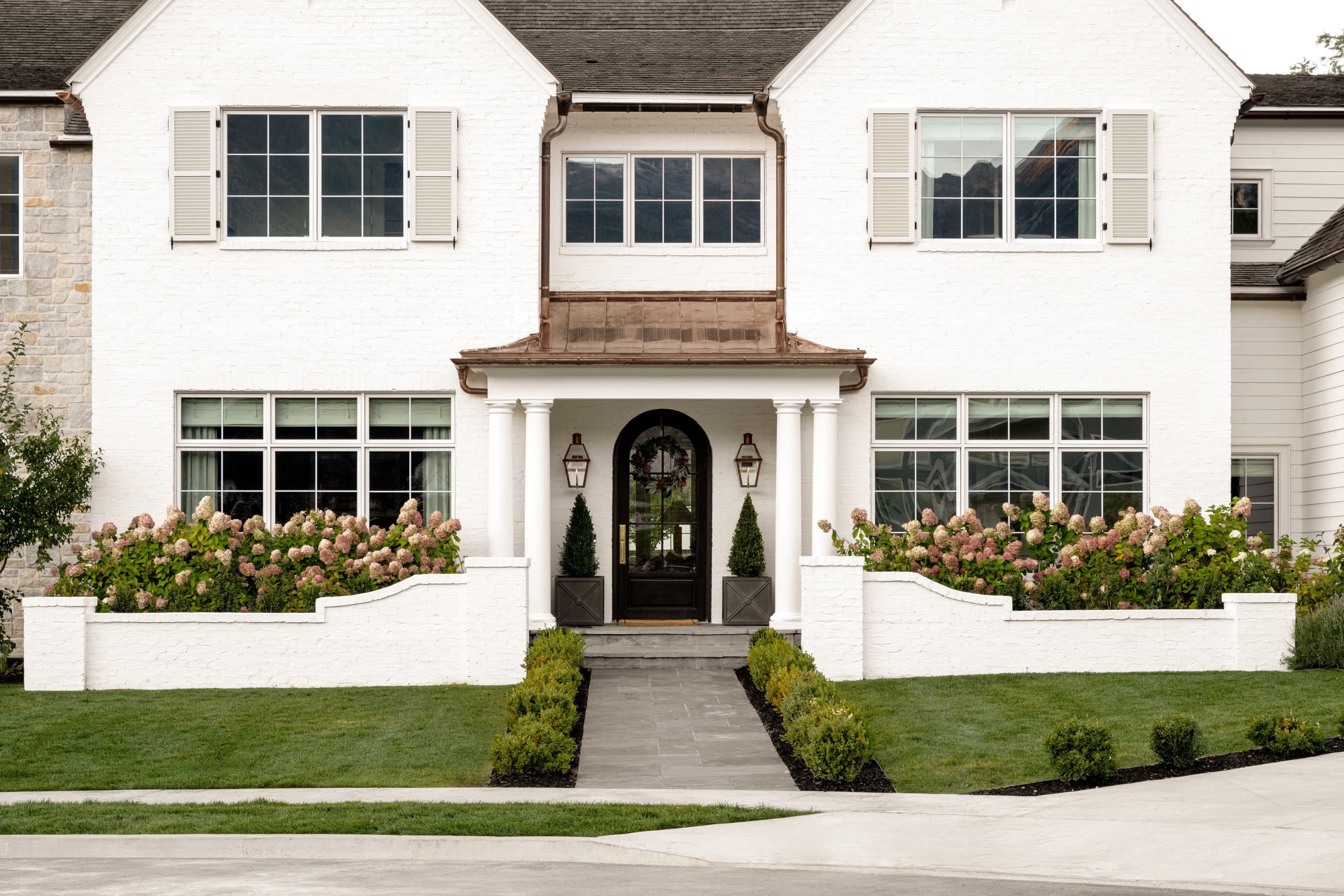In phase two of the build, Shea brought in exterior design elements that radiate time-honored character. The new front facade features a columned porch with a copper roof, stepped flairs and decorative vents on the brick, custom bifold shutters to the upper windows, curves to the garden wall, a bluestone walkway, an oval window, and gas lanterns.