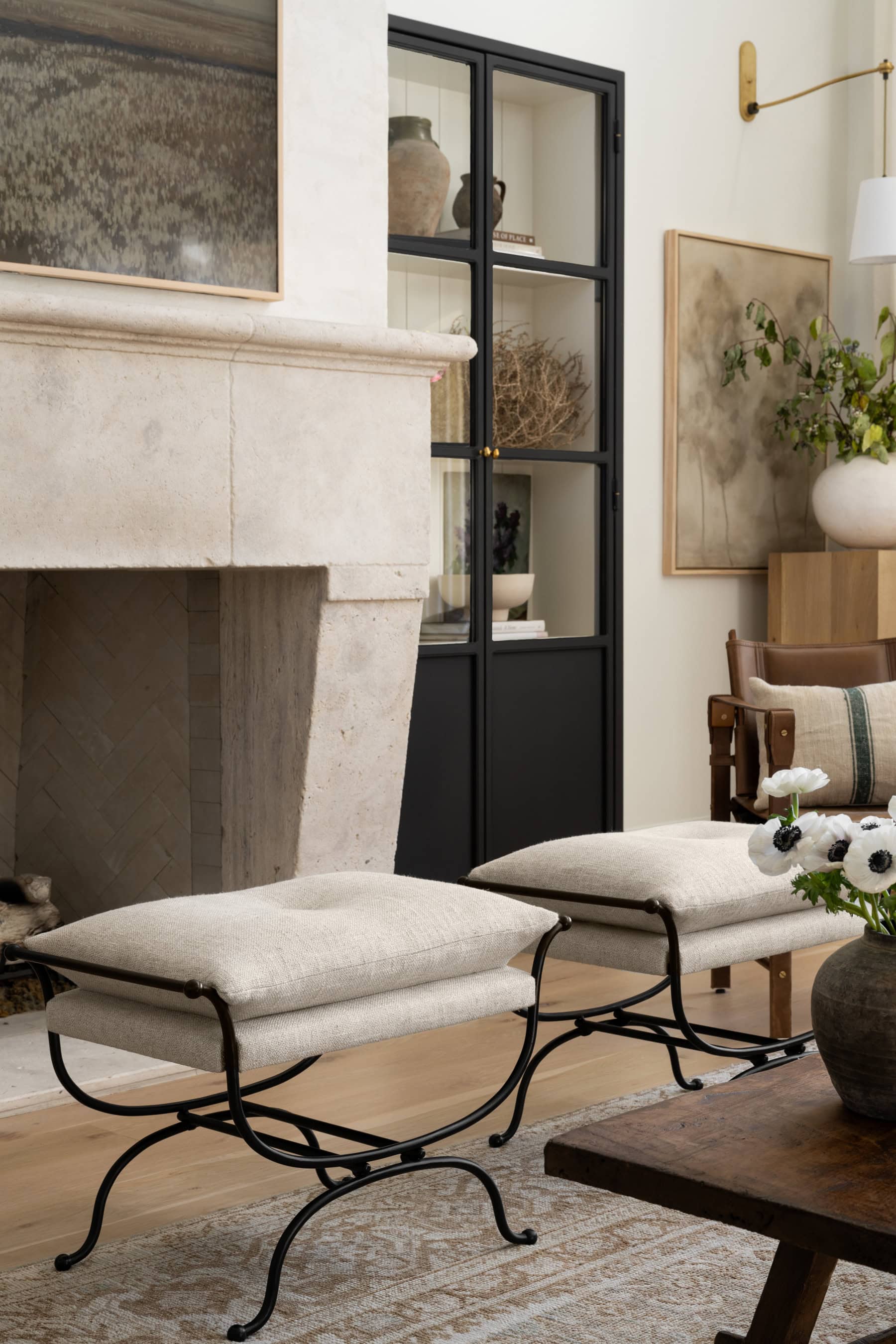 Being one of the busiest rooms in the home, Shea wanted to address the need for some family-centric storage in the entryway. To do that, she brought in a vintage chest with three drawers where the not-so-pretty things like socks and toothbrushes could be stashed away out of sight. Other than a few styling swaps, the main change made in the entryway was an aesthetic decision to maintain cohesion throughout the rest of the home. In the living room, Shea added plaster on top of the brick fireplace, a technique she mimicked on the entryway’s brick. The plaster adds texture and warmth to the space and flows nicely into the adjoining room.