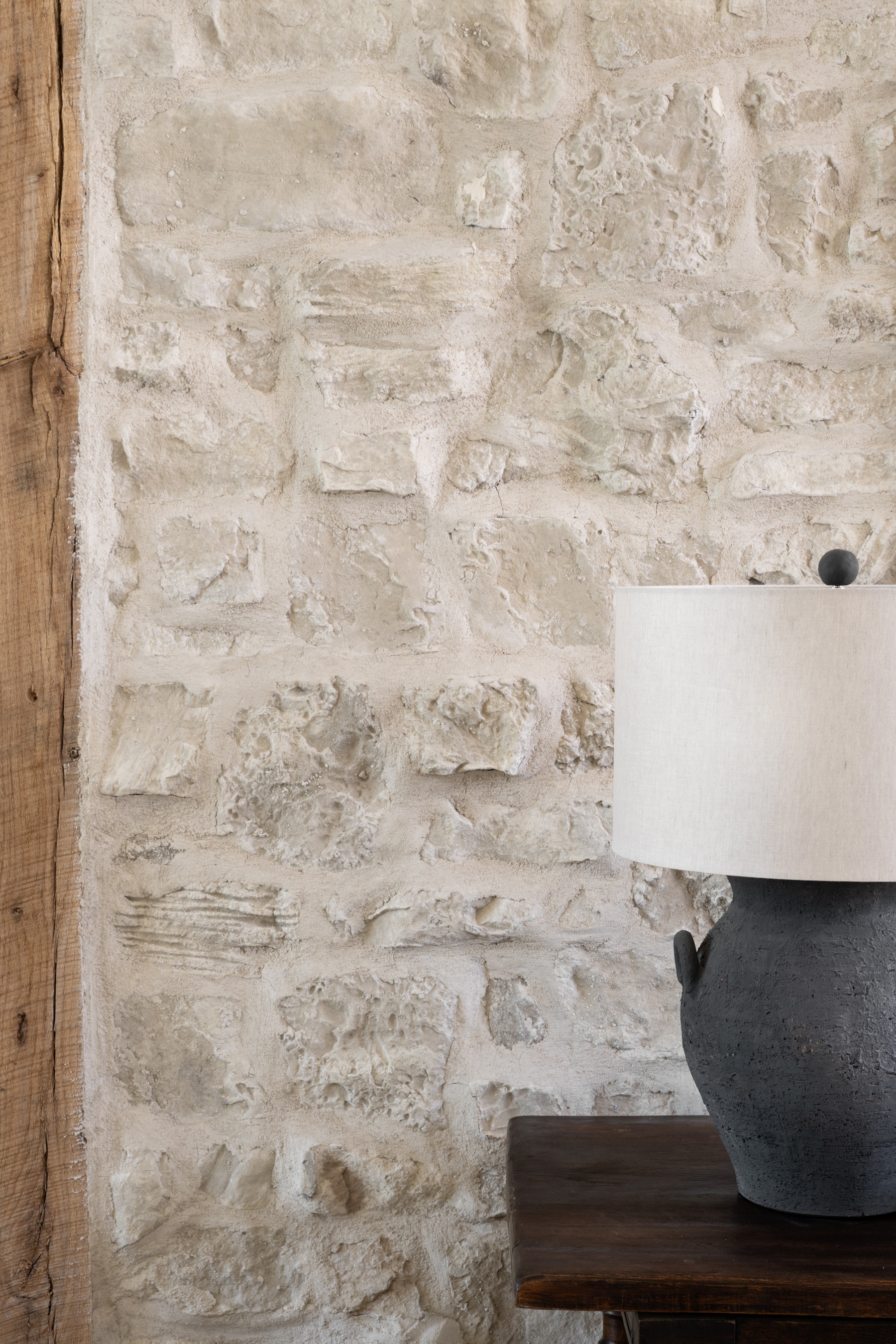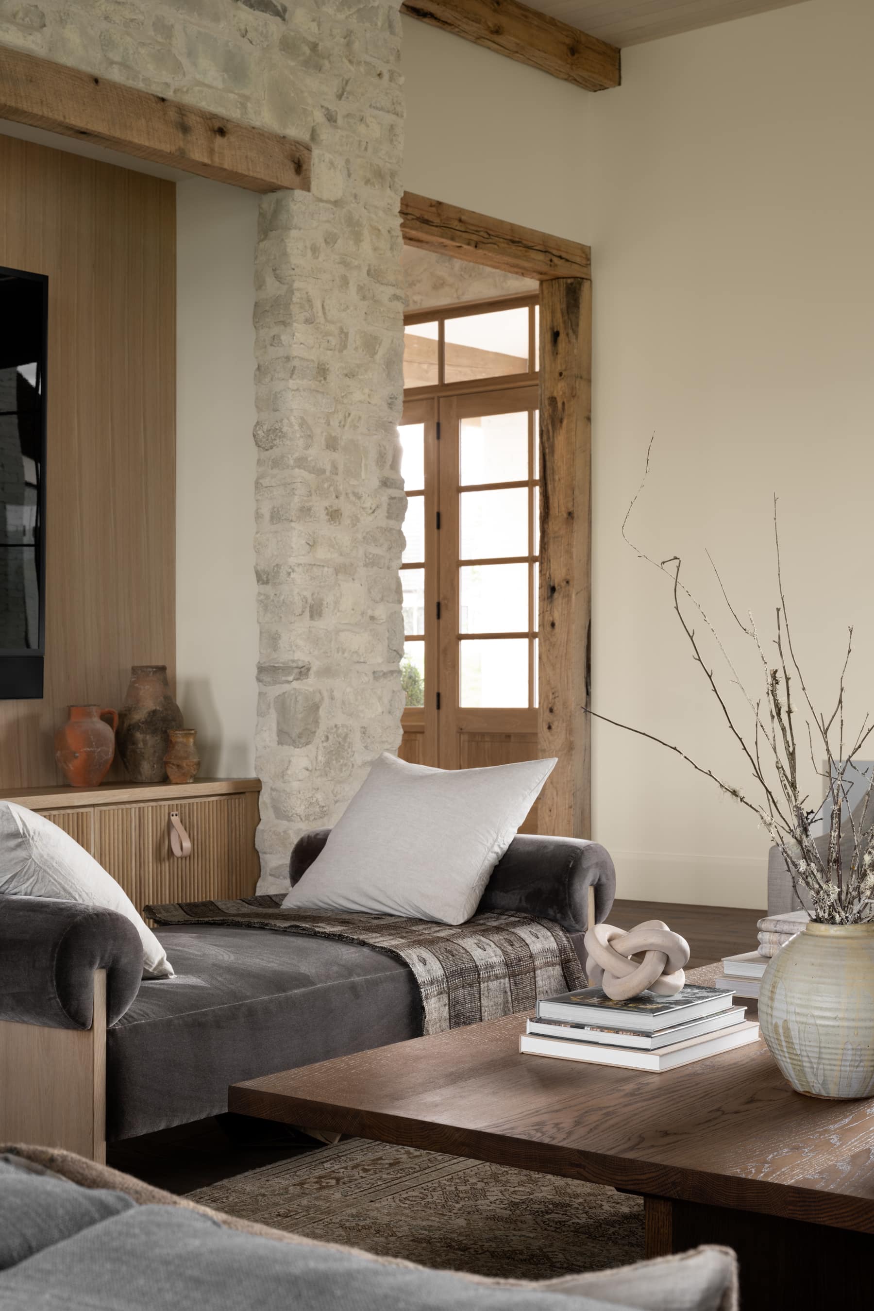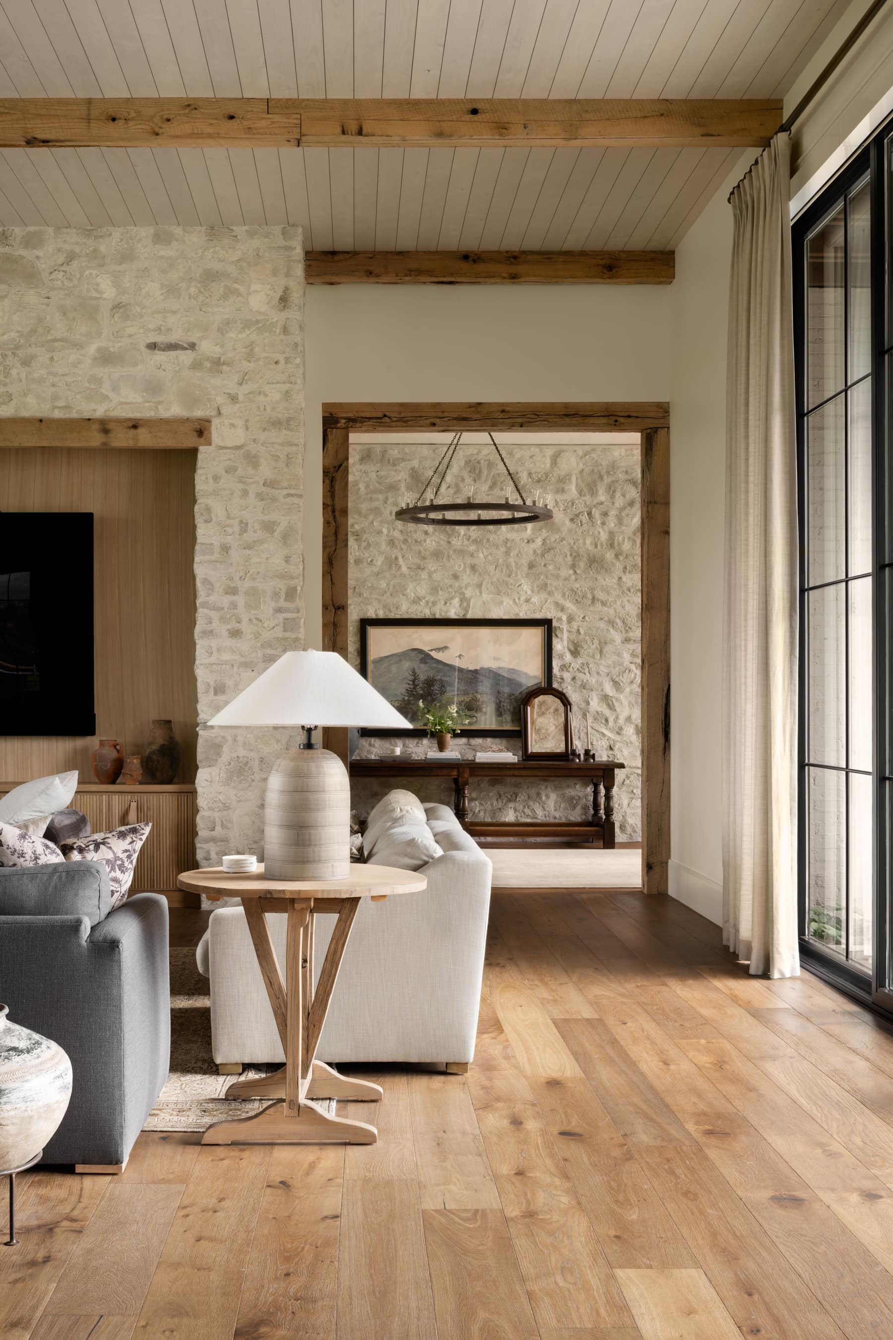 In every project Shea and the design team take on, there’s one defining element or direction that carries the design throughout the entirety of the home. Sometimes it’s a color theme, other times it’s a material. In our latest project, Water’s Edge, the one defining element is the use of an exterior material inside the home. Natural stone (called Colonial White Ridgestone) in a light, time-weathered hue marries the inside with the out, carrying the vibe of the house from room to room, down hallways and up staircases. Shea and the design team worked closely with the mason to get the grout style just right, the same style also carried throughout. In Water’s Edge, you’ll see the stone brought into the entryway of the home, rising up the walls to meet a plaster barrel ceiling for a grand welcome.
