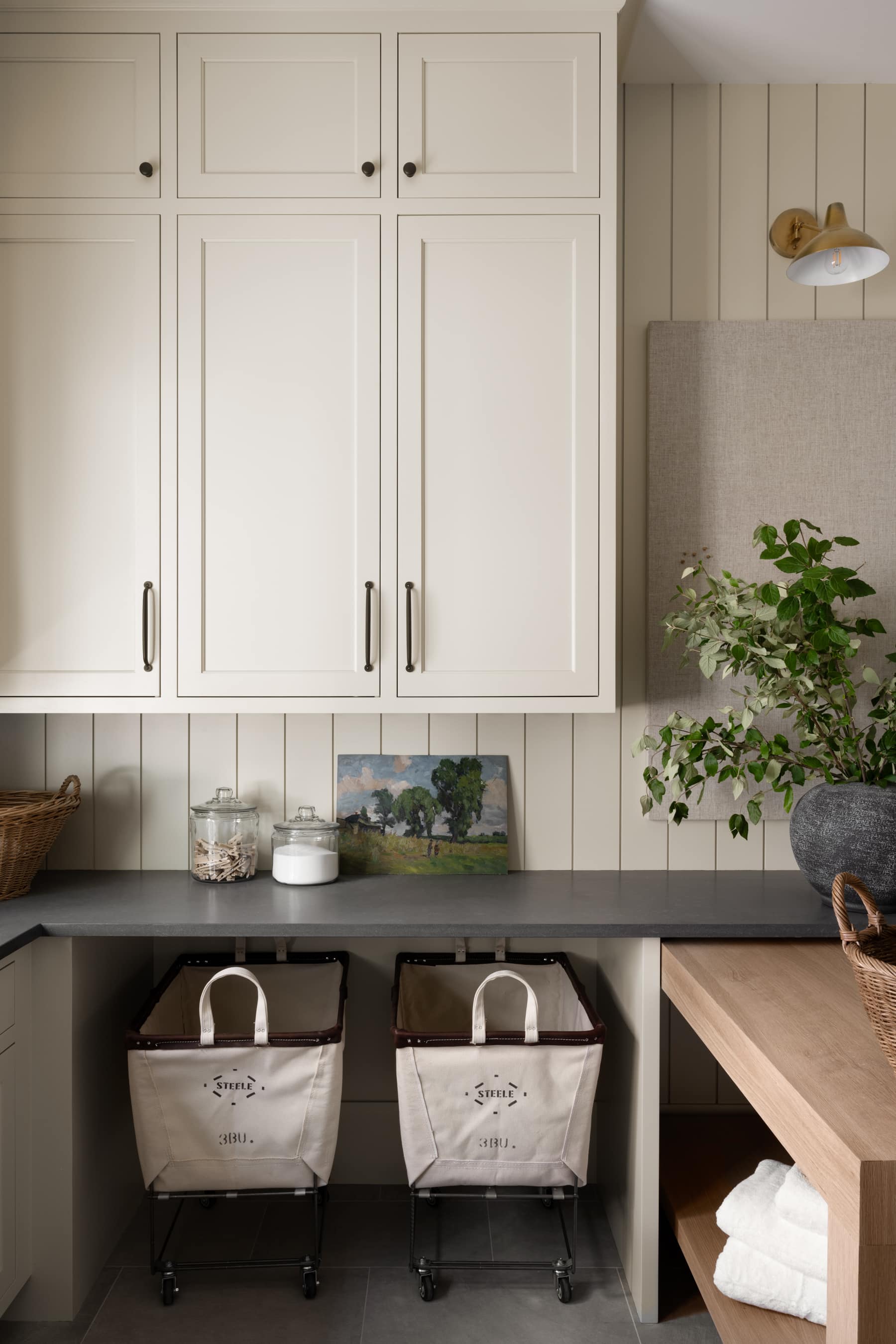 Moving into the double kitchen islands, Shea and the design team used a velvety grey-green shade (Fawn Brindle by Sherwin-Williams) on the lower cabinetry. Even though it isn’t a neutral, “it still reads soft and timeless and it adds so much to this kitchen,” notes Shea. On top of the cabinetry is a countertop that Shea says is one of the show-stopping elements of the space. “It’s actually porcelain not [marble],” she adds, and a bolder veining makes a statement on the two long island tops.
