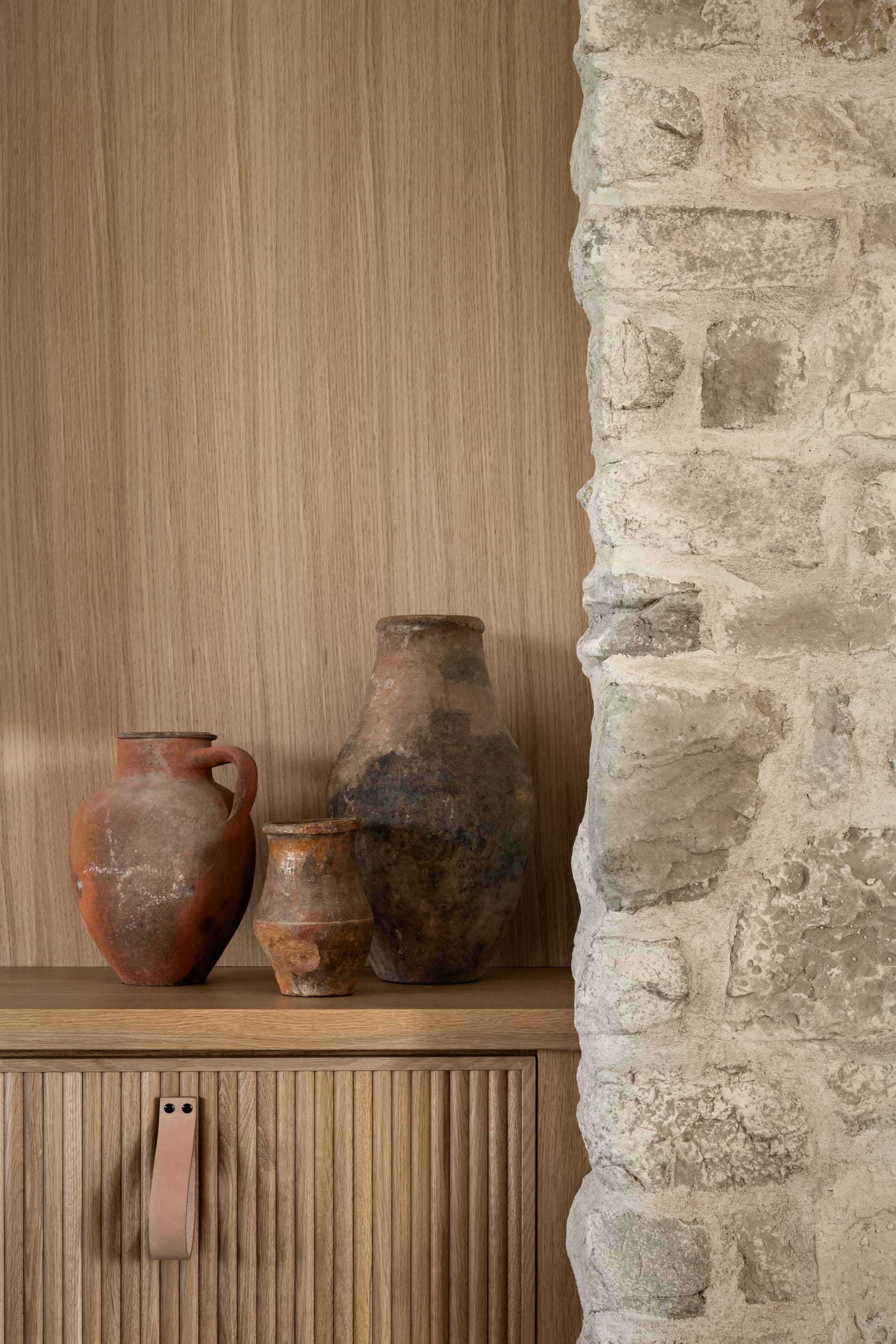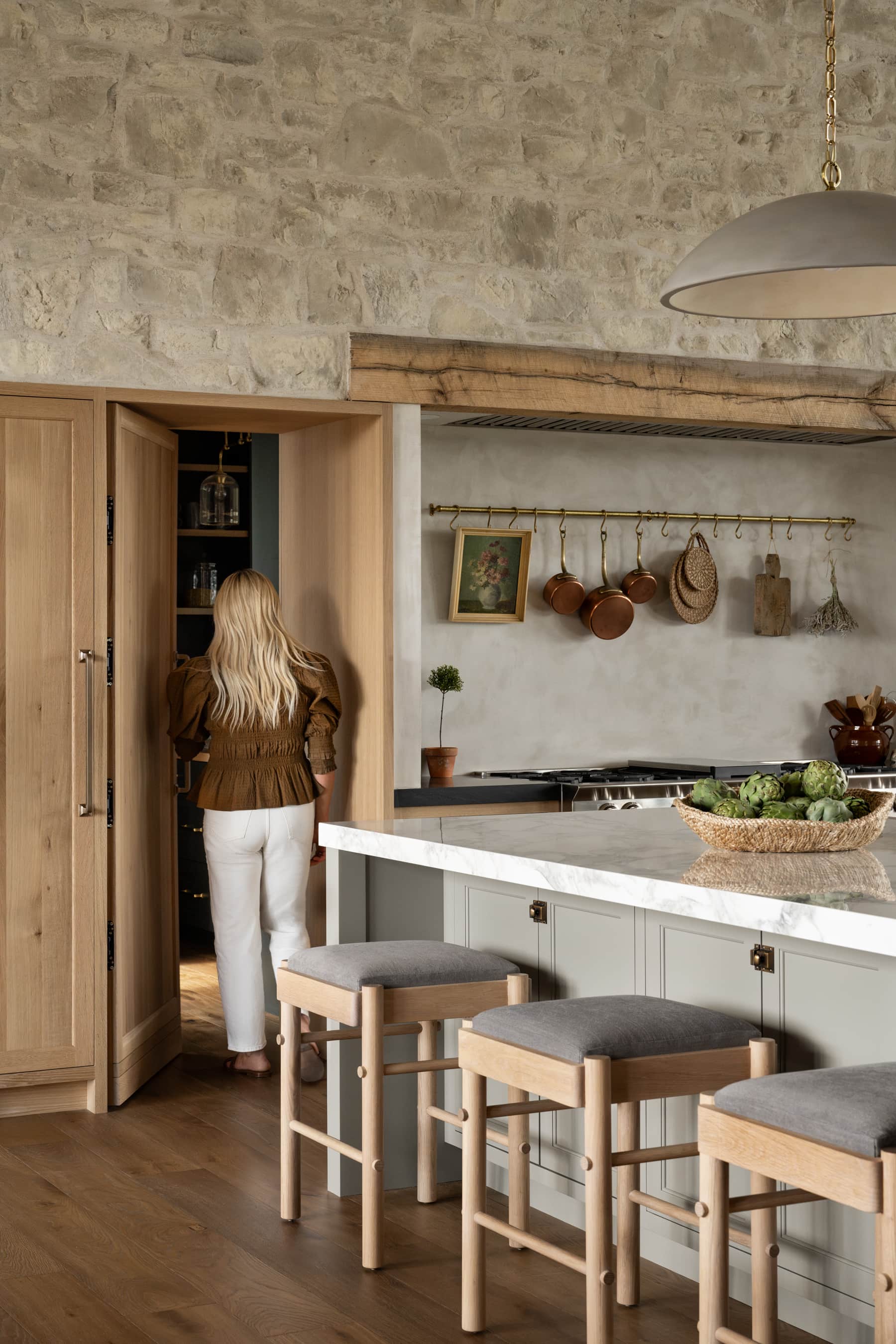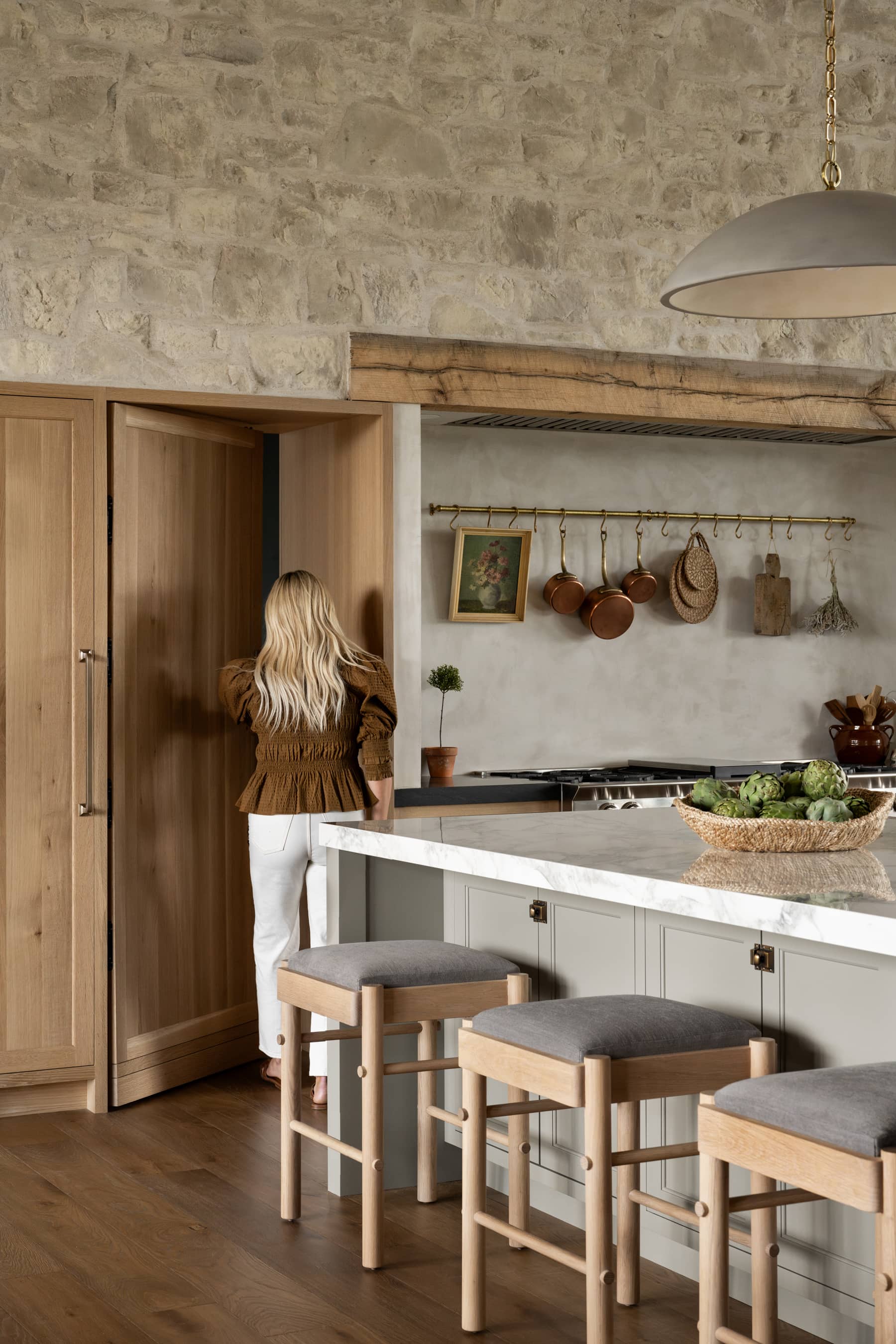 The first thing Shea and the design team did to warm up this kitchen was to bring the same elements seen outside of the house into the kitchen. For the focal point, “we wanted to incorporate the stone from the exterior house all the way across and then do an integrated hood,” Shea notes, adding a beam of reclaimed timber the length of the cooktop to tie into the timbers used throughout the expanse of the great room. In the cooktop’s backsplash and integrated niches on each side is the same plaster you’ll find in the entryway’s barrel ceiling. “It’s a nice break from the stone but still feels warm and in the same color palette,” Shea explains. This highly textured look adds depth and movement to a space with its natural variations in tone. The raw state and perfect patina are reminiscent of a well-loved kitchen in the Cotswolds. Shea and the design team added depth to the space with mix-and-match white oak cabinetry, antiqued brass hardware, and a honed black granite countertop. Styling accessories finish the look with a brass pot rail, aged copper pots, and vintage wood cutting boards.