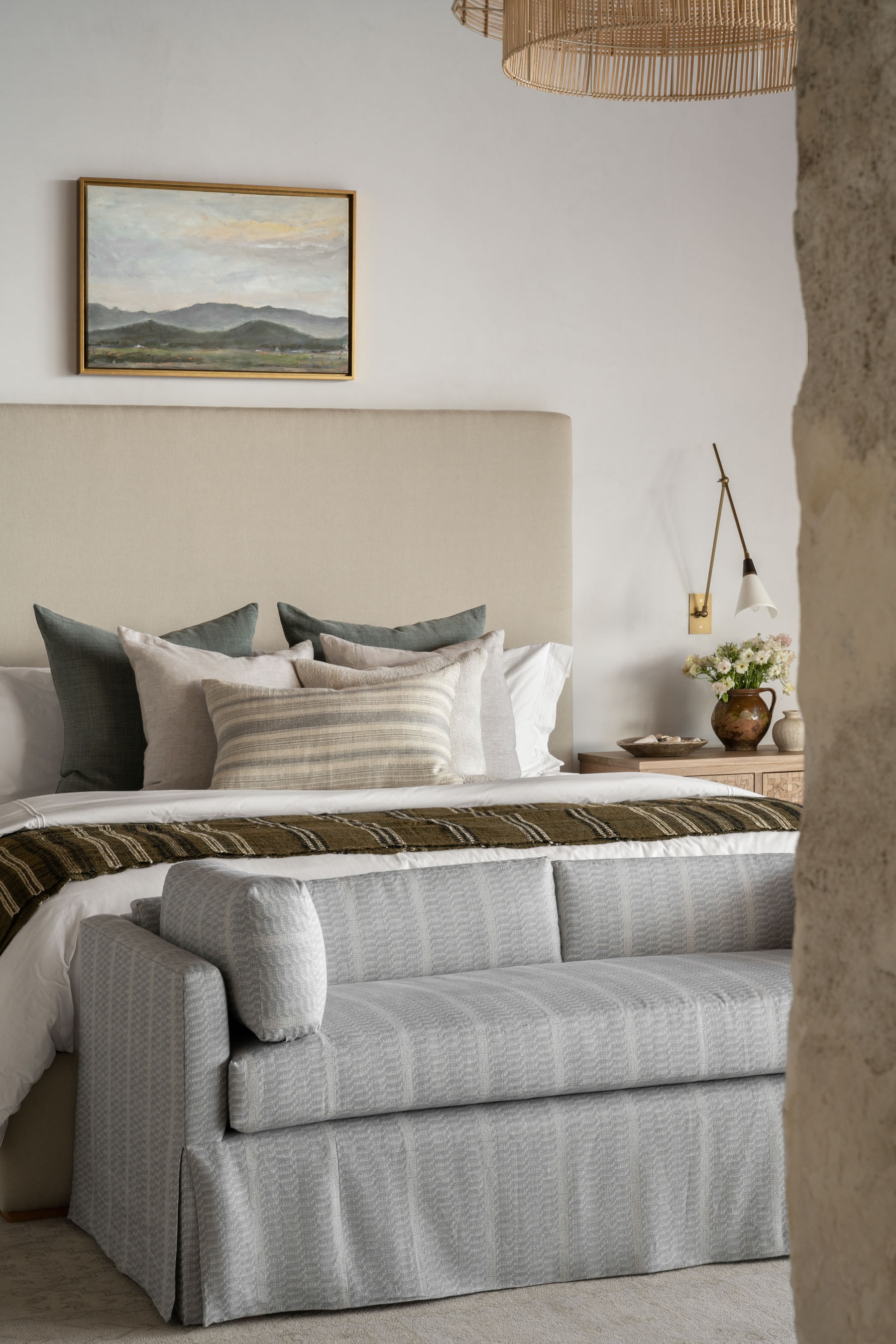 In the main bedroom space, “our client really wanted a serene primary suite with pale blue plaster walls.” This treatment is used on every wall of the home and there are just a few that got a change in color, the primary suite being one of them. The sandy, natural tones are tied together throughout with a hand-knotted vintage rug and a mix of new and vintage pillows. “We’re not going pattern-heavy on the pillows because we did a settee [at the foot of the bed] in a pattern,” Shea says of the design decisions made in the room.
