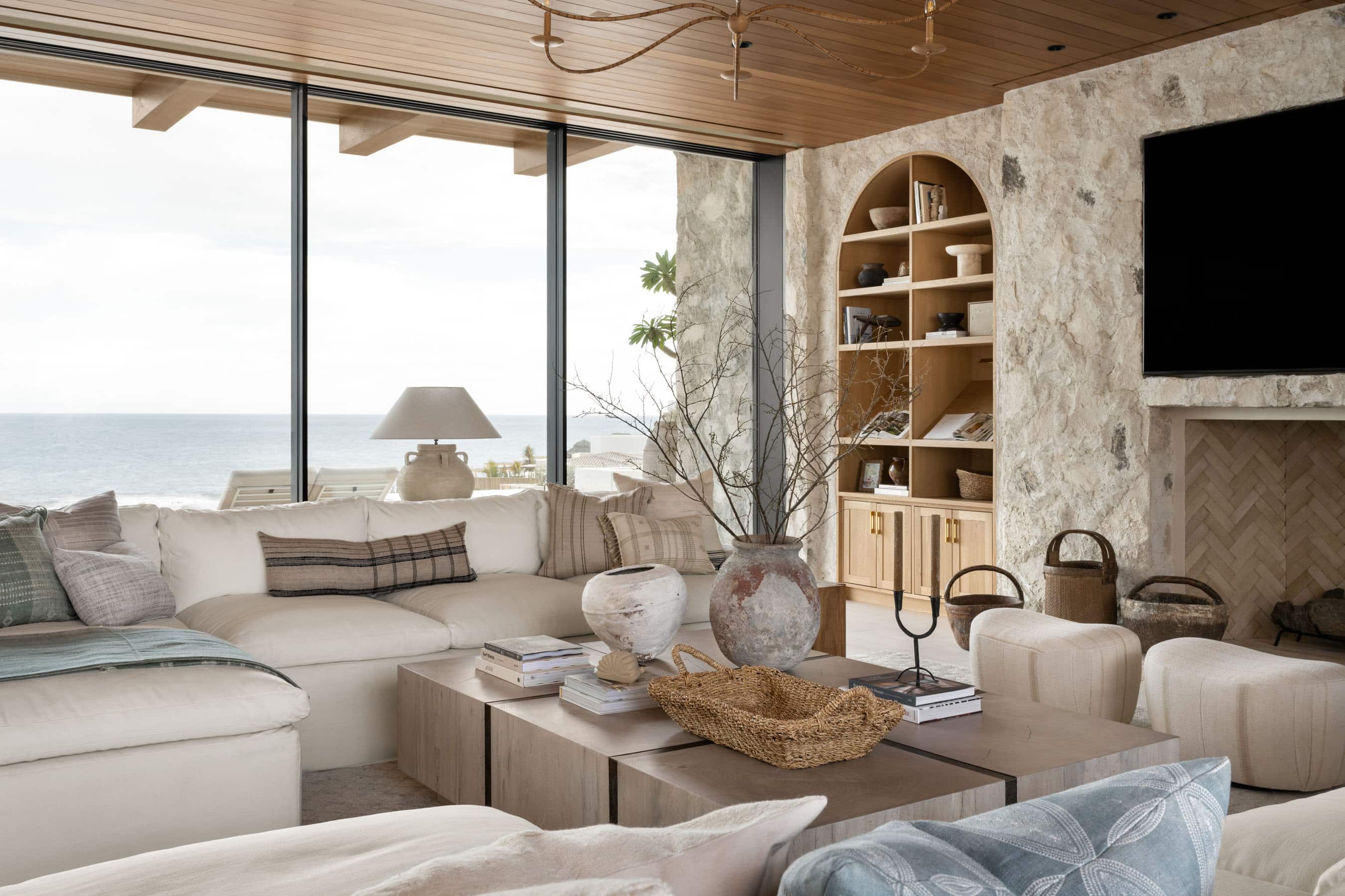 The client wanted to be able to host a lot of people so for the furniture orientation “We did two sectionals facing each other and then a massive coffee table,” explains Shea. The styling of the space sticks to coastal tones without leaning too heavily into a beachy aesthetic. Earth tones dominate the palette.
